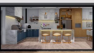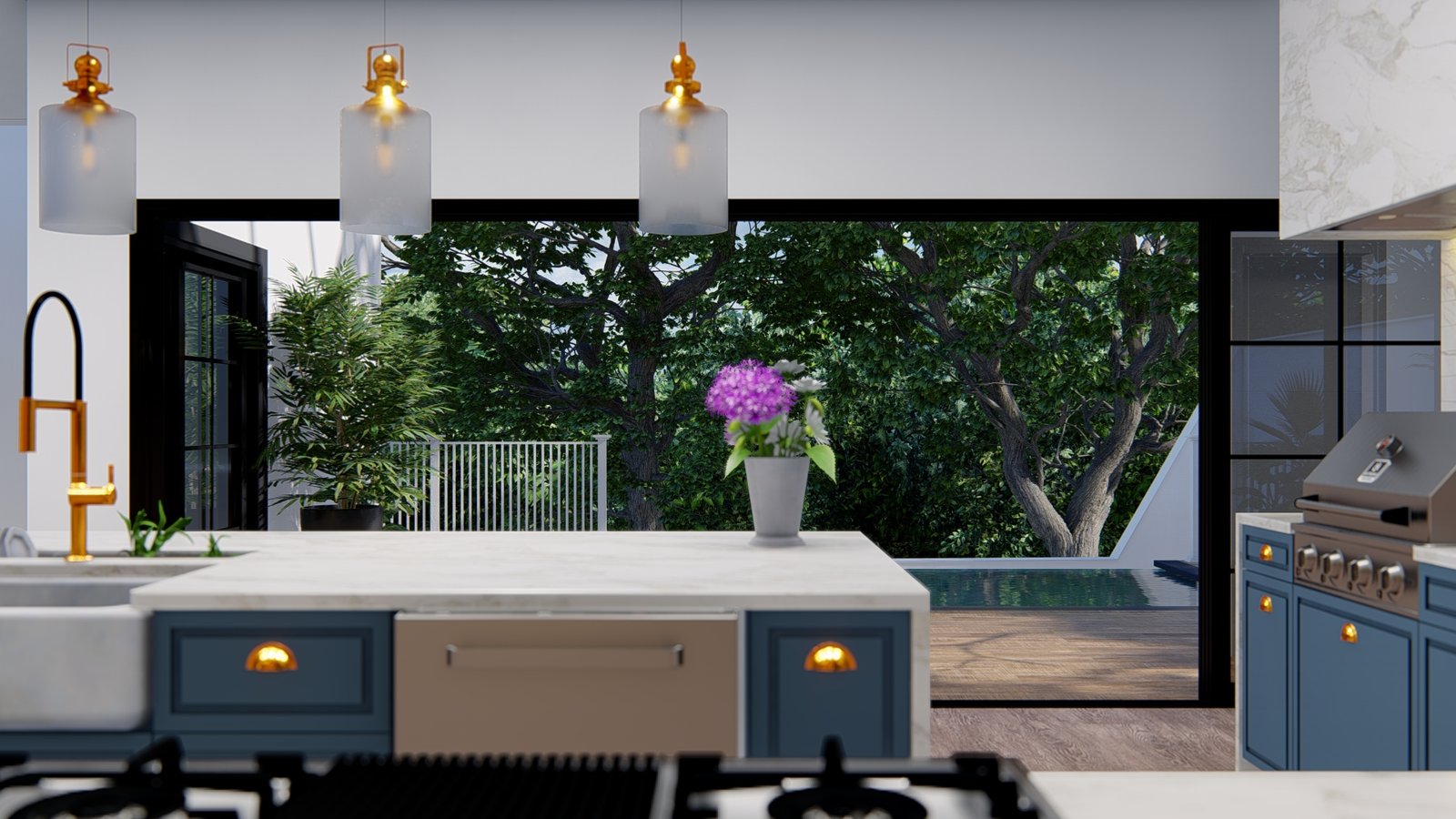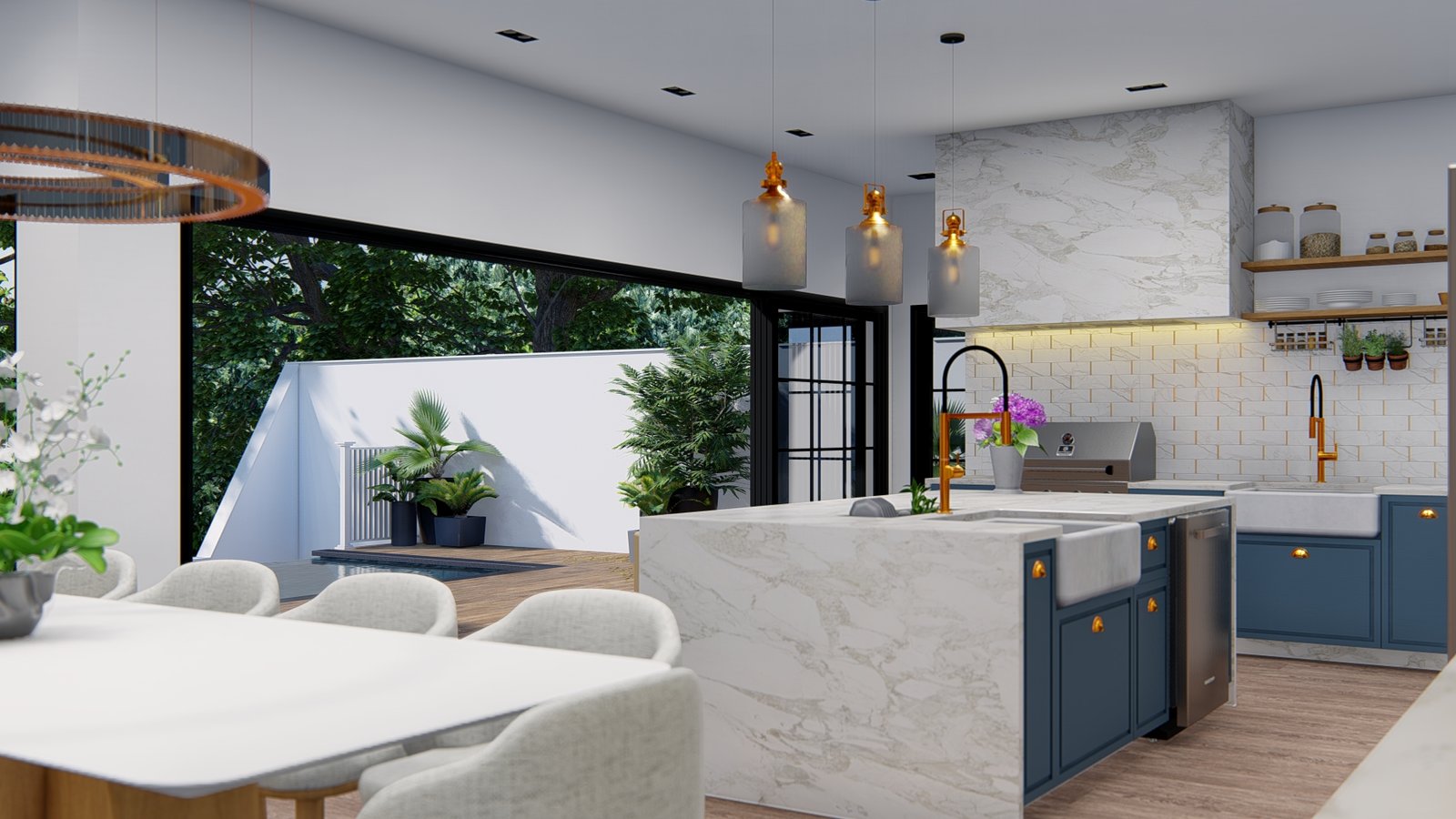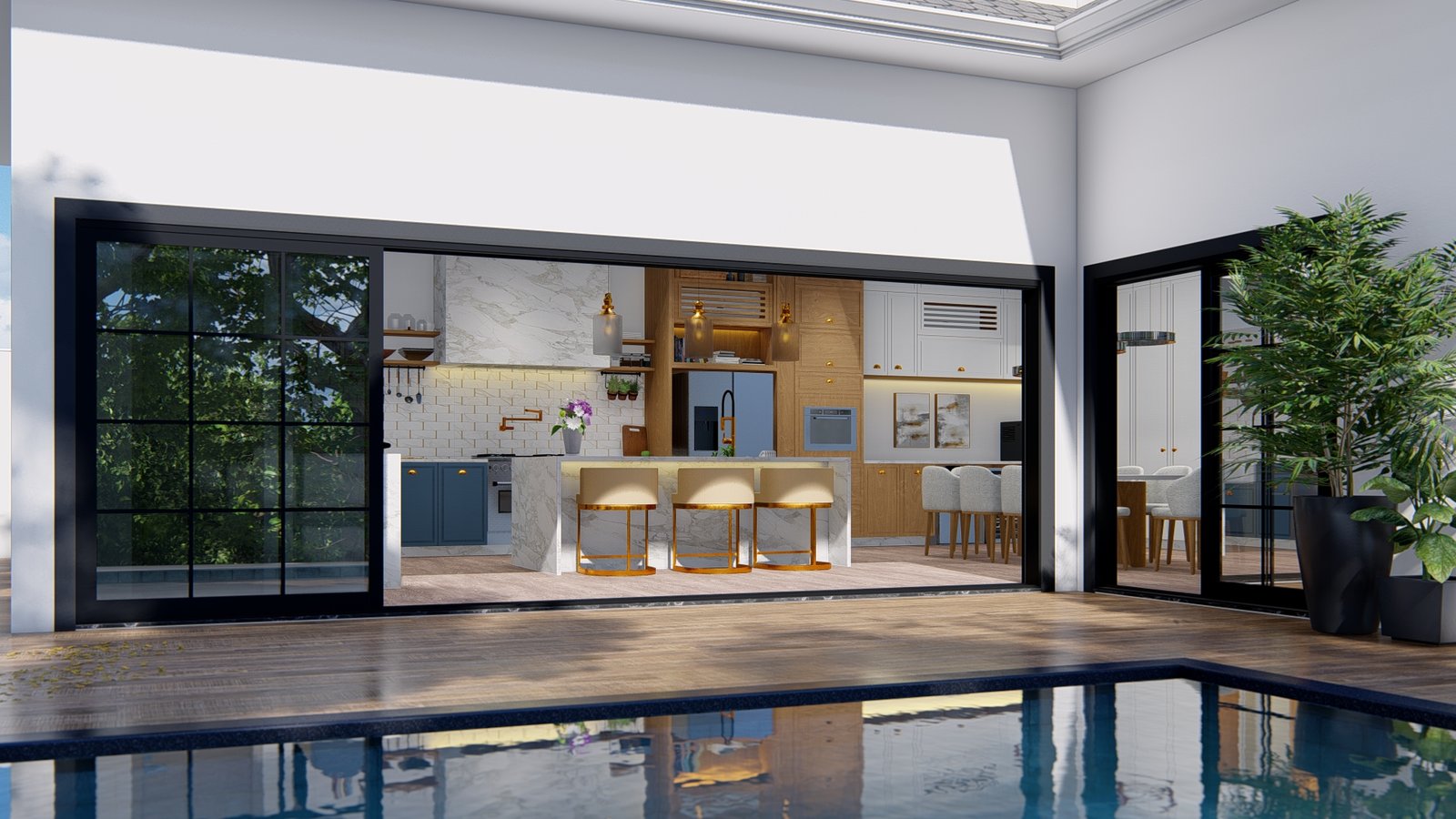 Este projeto combina elegância e funcionalidade em um ambiente gourmet integrado à área de lazer. A transição fluida entre o espaço interno e a piscina cria uma conexão perfeita com o exterior, valorizando momentos de convivência.