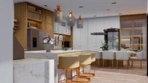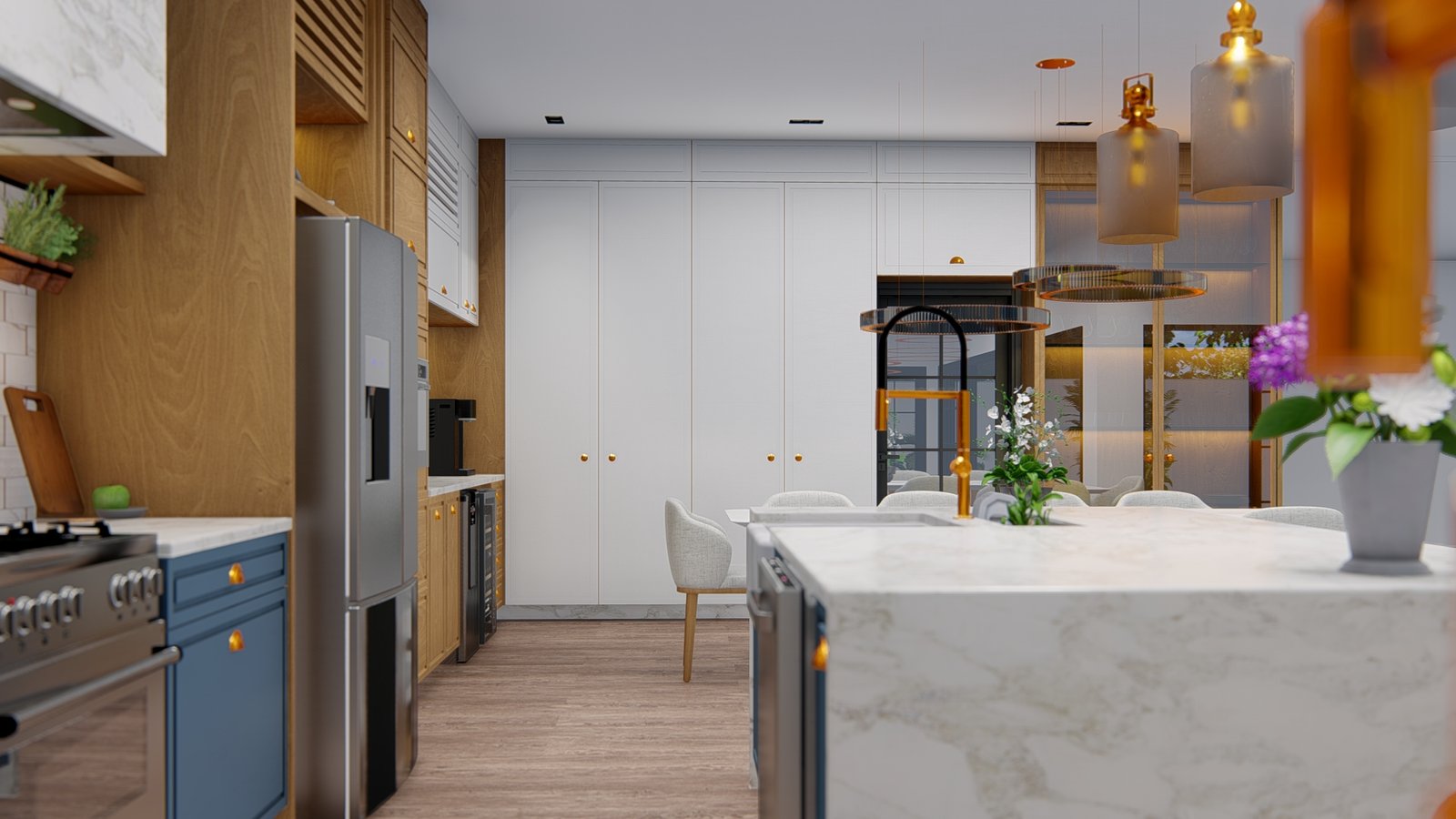 Com acabamentos em mármore, madeira e detalhes em cobre, a cozinha apresenta um equilíbrio entre sofisticação e aconchego. O layout aberto conta com uma ilha central que serve como ponto de encontro, ideal para refeições informais e sociais. Equipamentos modernos, uma churrasqueira embutida e um forno a lenha reforçam a proposta de um espaço prático e acolhedor. A iluminação suave e os móveis cuidadosamente dispostos proporcionam conforto e estilo, tornando o ambiente perfeito para reunir amigos e família.